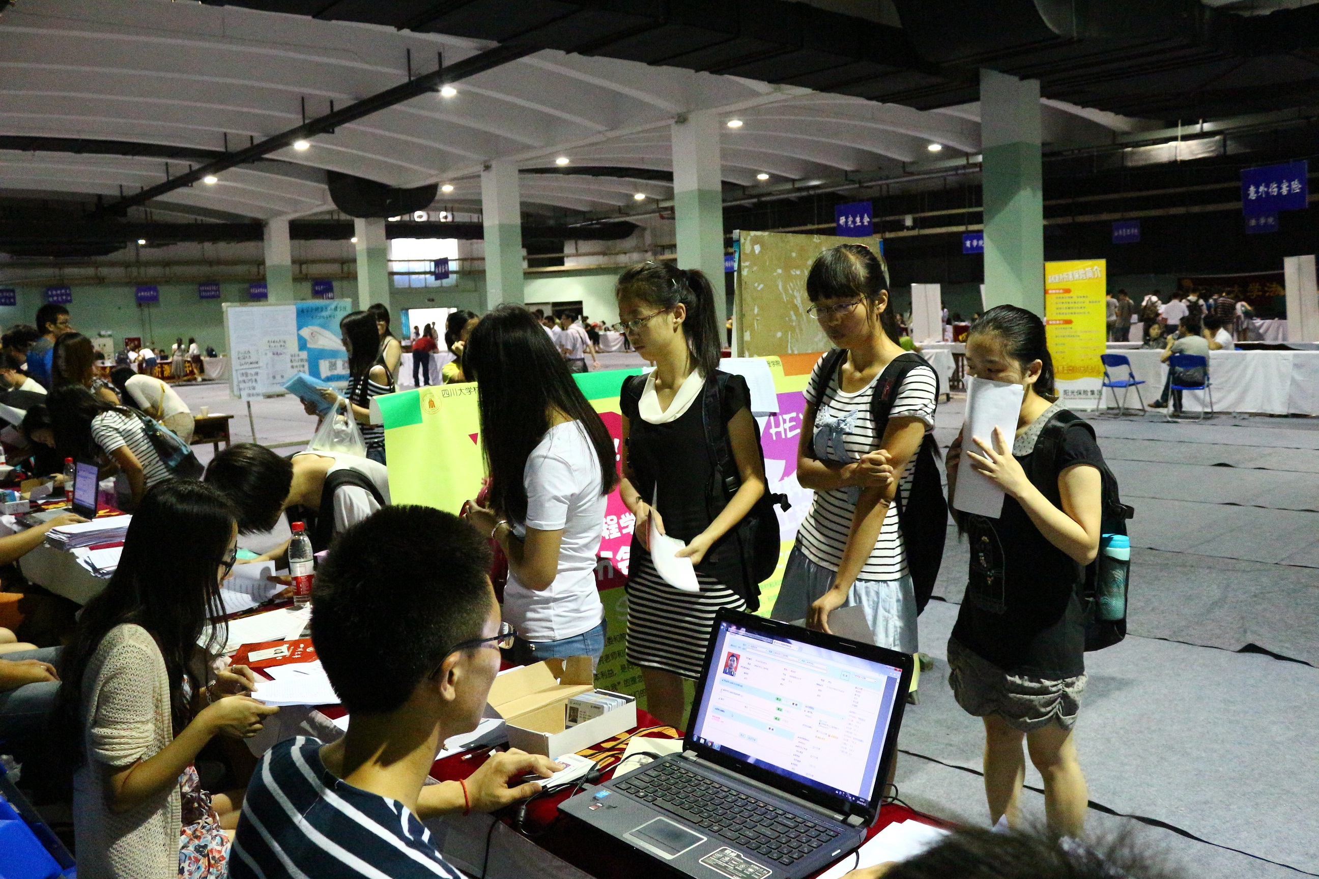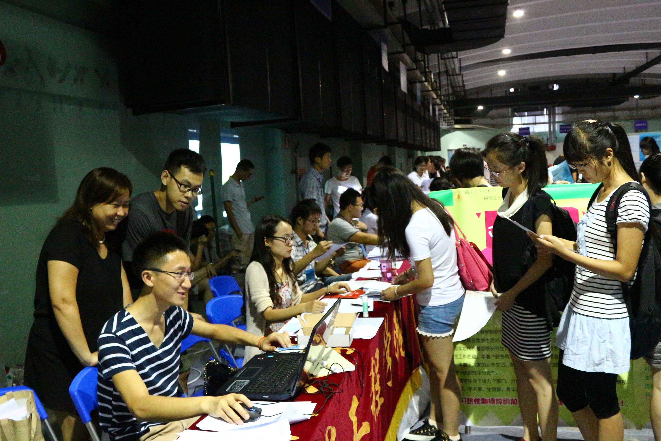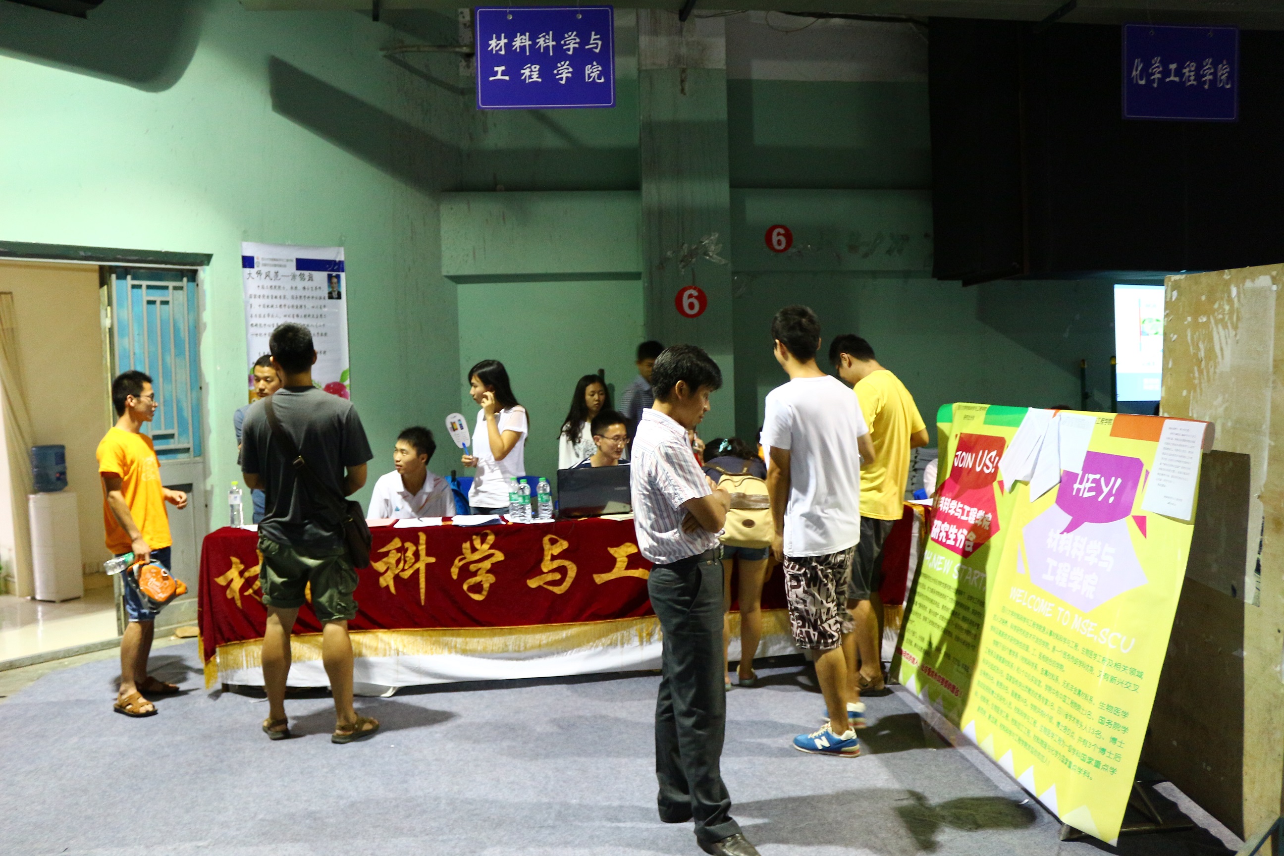 红色横幅、升空气球、巨幕电视、翠绿阳伞,体育馆的别样风景带我们走进了一年一度的迎新季。2014年9月12日,四川大学材料科学与工程学院迎来了2014级硕、博士研究生新生。为期两天的迎新工作中,老师和同学们克服天气炎热的不利条件,圆满完成了迎新工作。