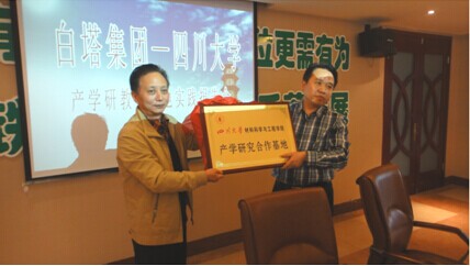 图. 四川大学材料科学与工程学院尹光福院长向四川白塔陶瓷集团徐小洪董事长授“产学研合作基地”牌