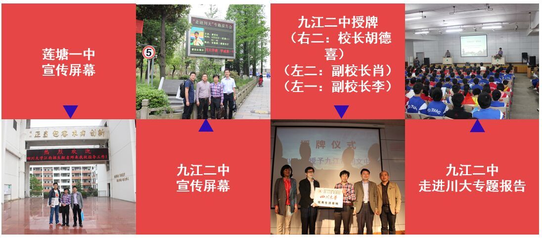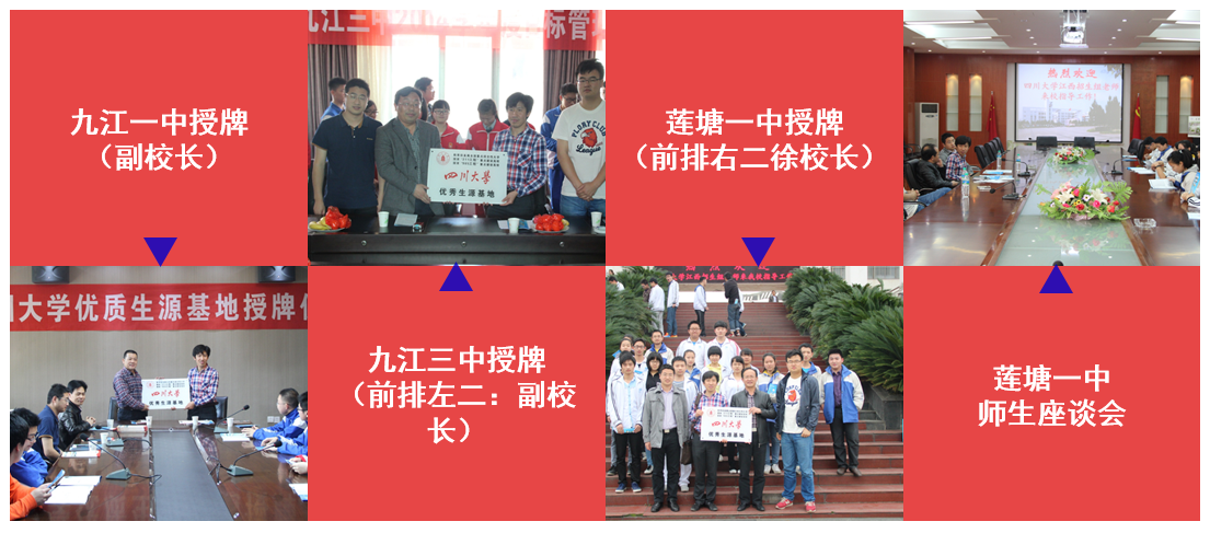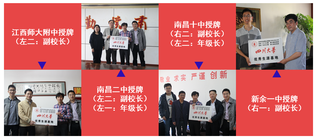 今年4月,唐世红副书记带队前往江西省,亲自为江西9所重点中学授予“四川大学优秀生源基地”,深化了“高校——中学”生源输送、合作交流之间的战略关系;这是四川大学首次以省为单位,统一为重点中学授牌,社会反响强烈,保障我校在江西省的优质生源选拨。