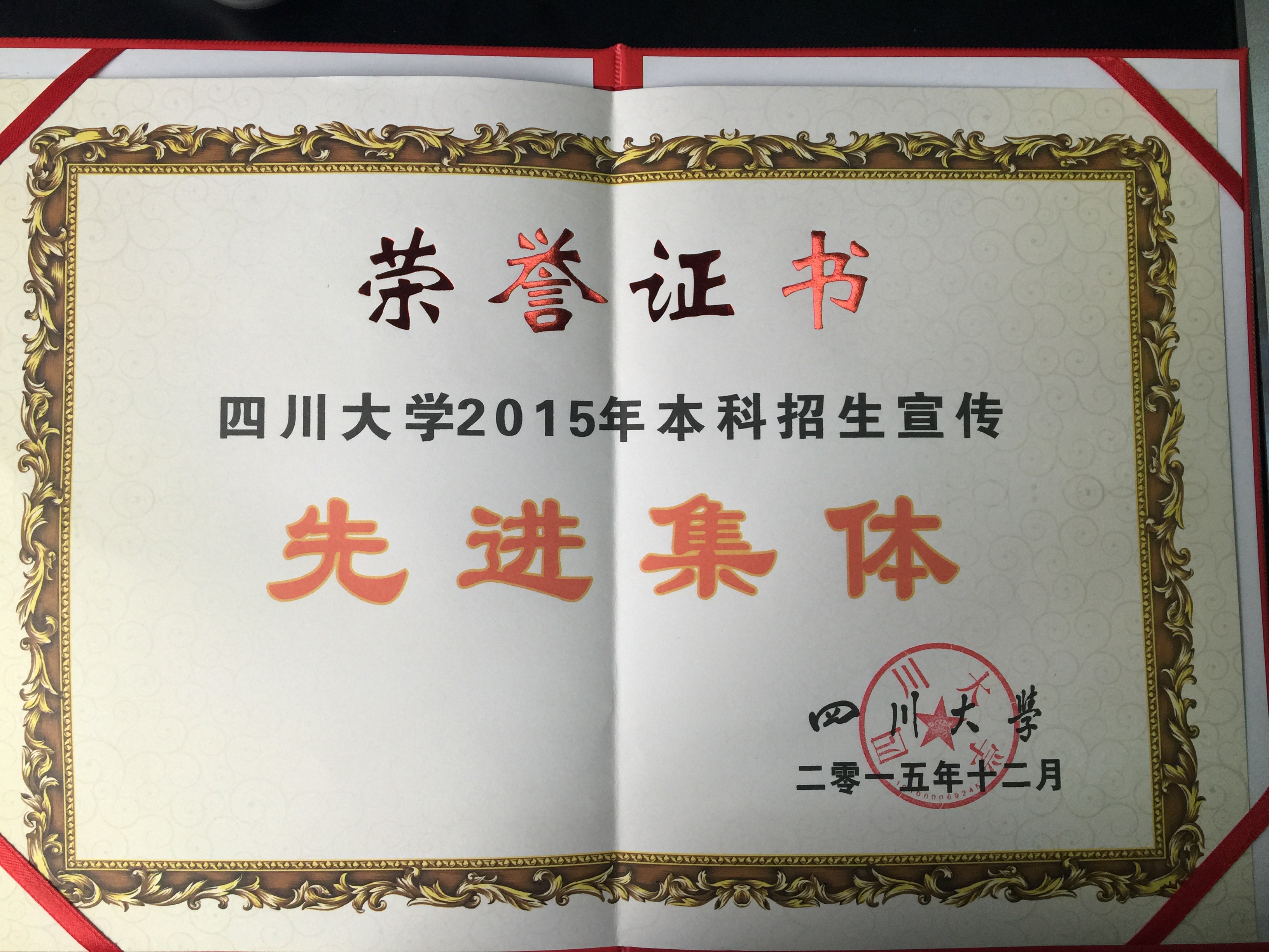 在我院招生宣传工作小组的不懈努力之下,江西理科调档线从2010年的“高于一本线43分”提高到2015年的“高于一本线63分”,荣获“四川大学2015年本科招生宣传先进集体”,特此祝贺!同时,鼓励广大教职员工积极投身到本科生招生宣传工作中来,2017年全国高考招生制度改革全面展开,届时会涉及到所有专业的招生录取,希望通过大家的努力,保障我院优质生源的招收!