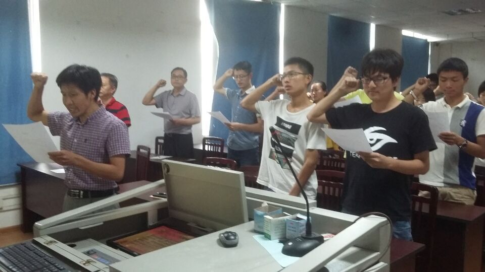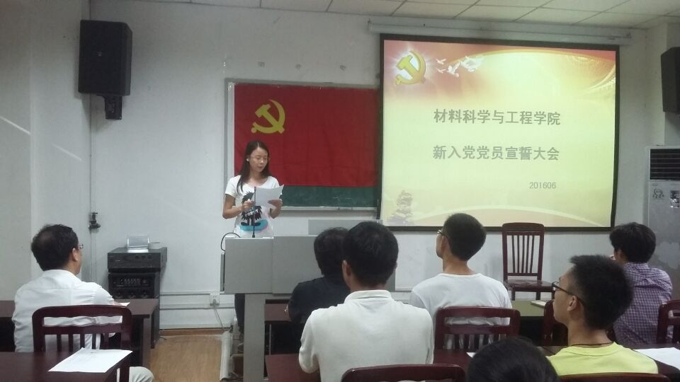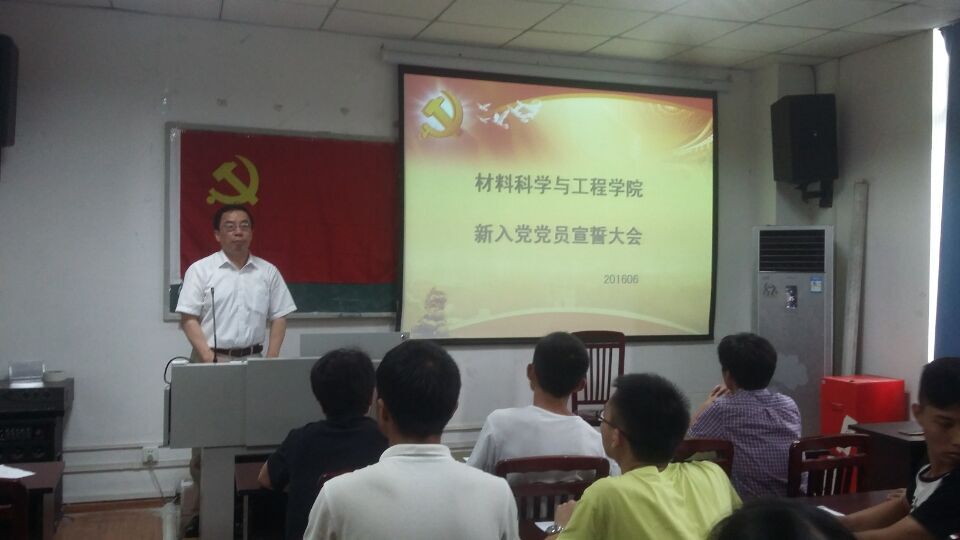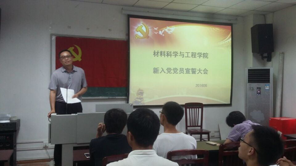 2016年6月22,16:00,第一理科楼209,材料科学与工程学院隆重举行材料科学与工程学院新入党党员宣誓大会。院长尹光福教授,副书记唐世红老师,党支部书记韩纪梅、王娇、余鹏飞,党员代表黄忠兵、郑婷以及2015年6月至今全体新入党党员。大会由党委书记朱建国教授主持。