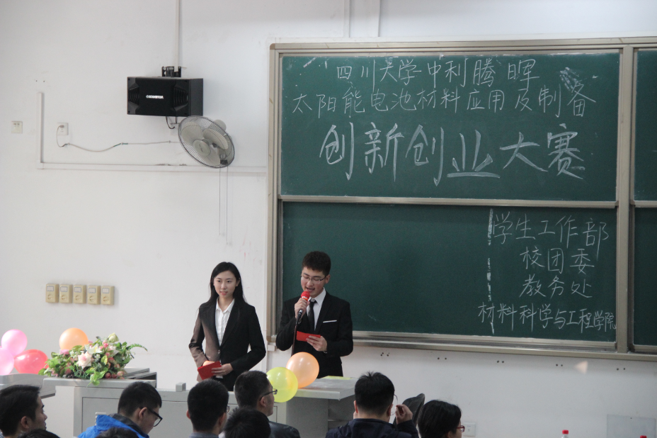 四川大学材料科学与工程学院与中利腾晖光伏科技有限公司强强联手举办的太阳能电池材料应用及制备创新创业大赛宣讲会于2016年11月18日下午两点半在四川大学江安校区综合楼c座503教室拉开帷幕并在一个小时的热烈讨论后圆满结束。此次宣讲会到场嘉宾有:中利腾晖光伏科技有限公司科技项目经理朱丹凤经理、材料科学与工程学院13级辅导员王志超老师、16级辅导员余鹏飞老师。