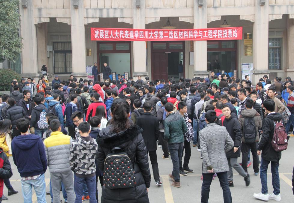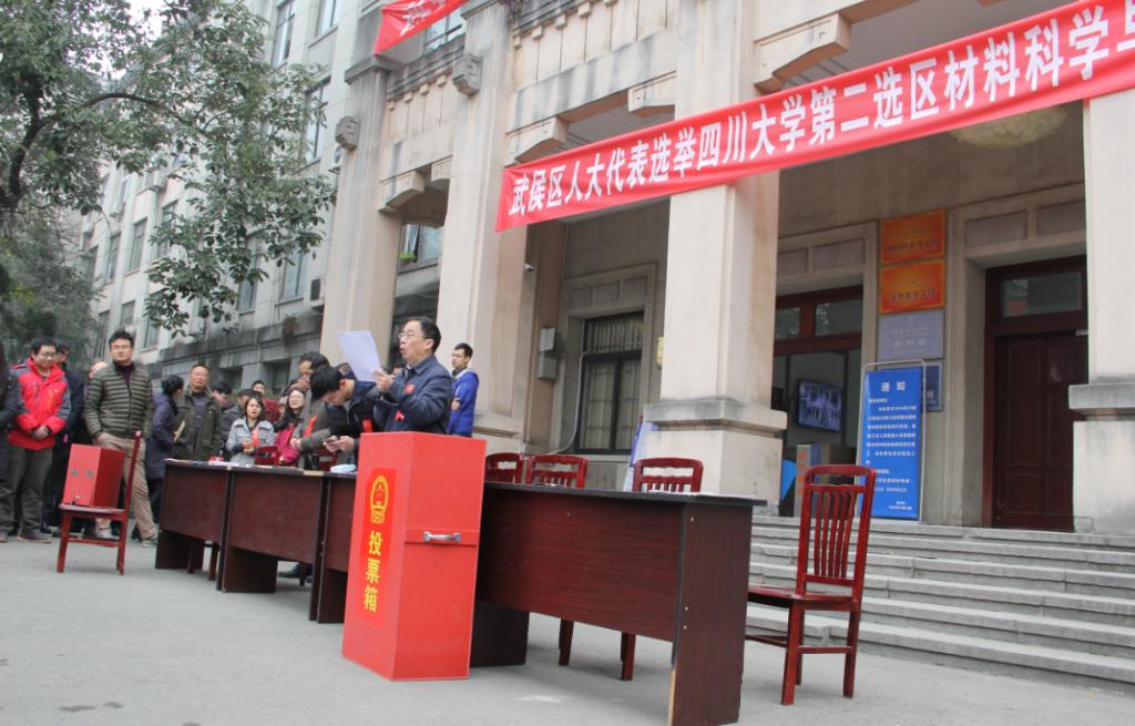 2016年12月8日上午10点,四川大学第二选区材料科学与工程学院投票站举行武侯区2016年人大代表选举。投票站选举工作由材料科学与工程学院党委书记朱建国教授主持,学院工会主席周大利老师和学院就业联络科科长韩纪梅副教授担任监票人。投票站工作按照《武侯区人大代表选举办法》规定的程序有序进行。全院共有849名选民,发出选票838张,收回选票833张,选举圆满完成。