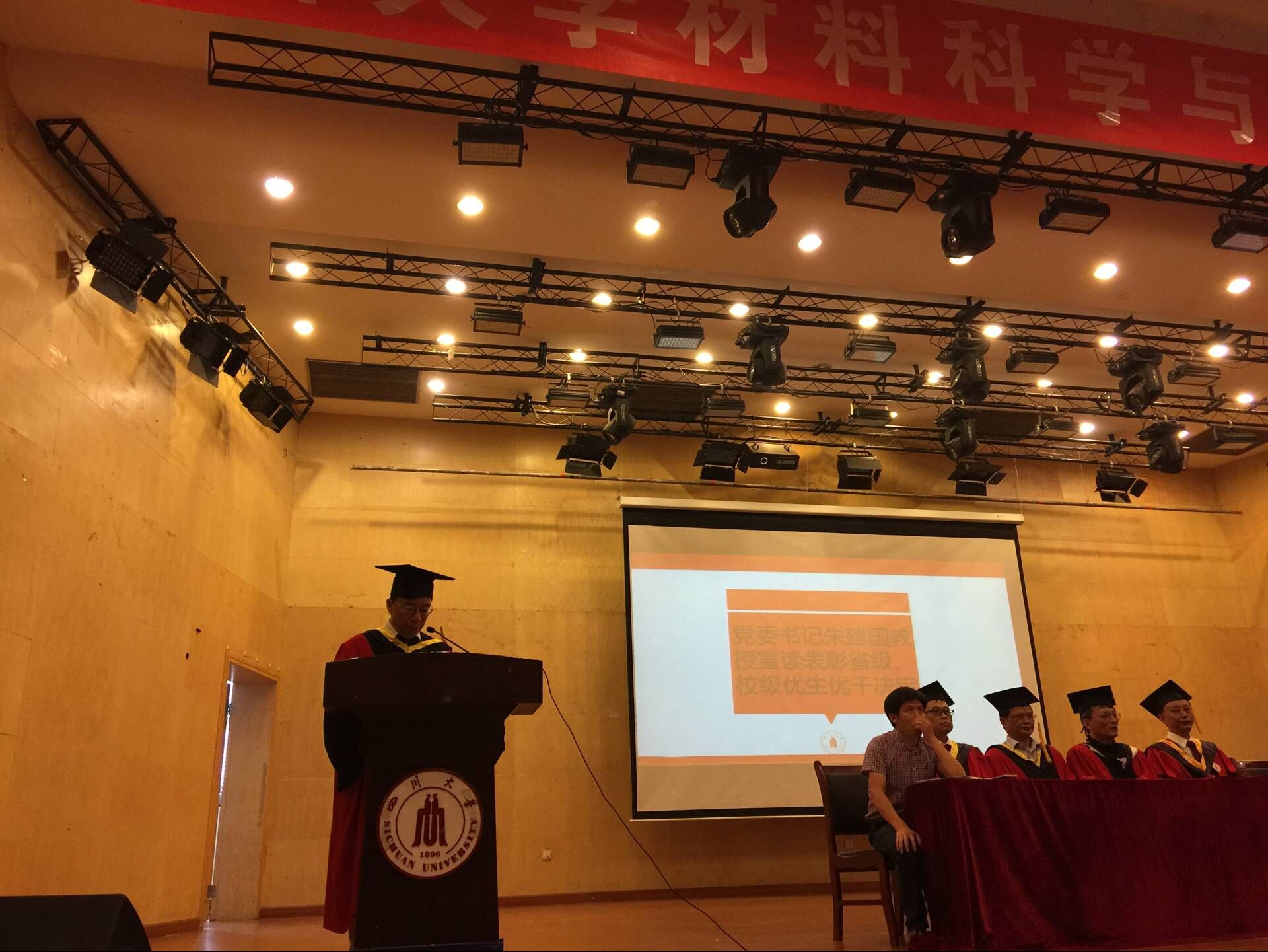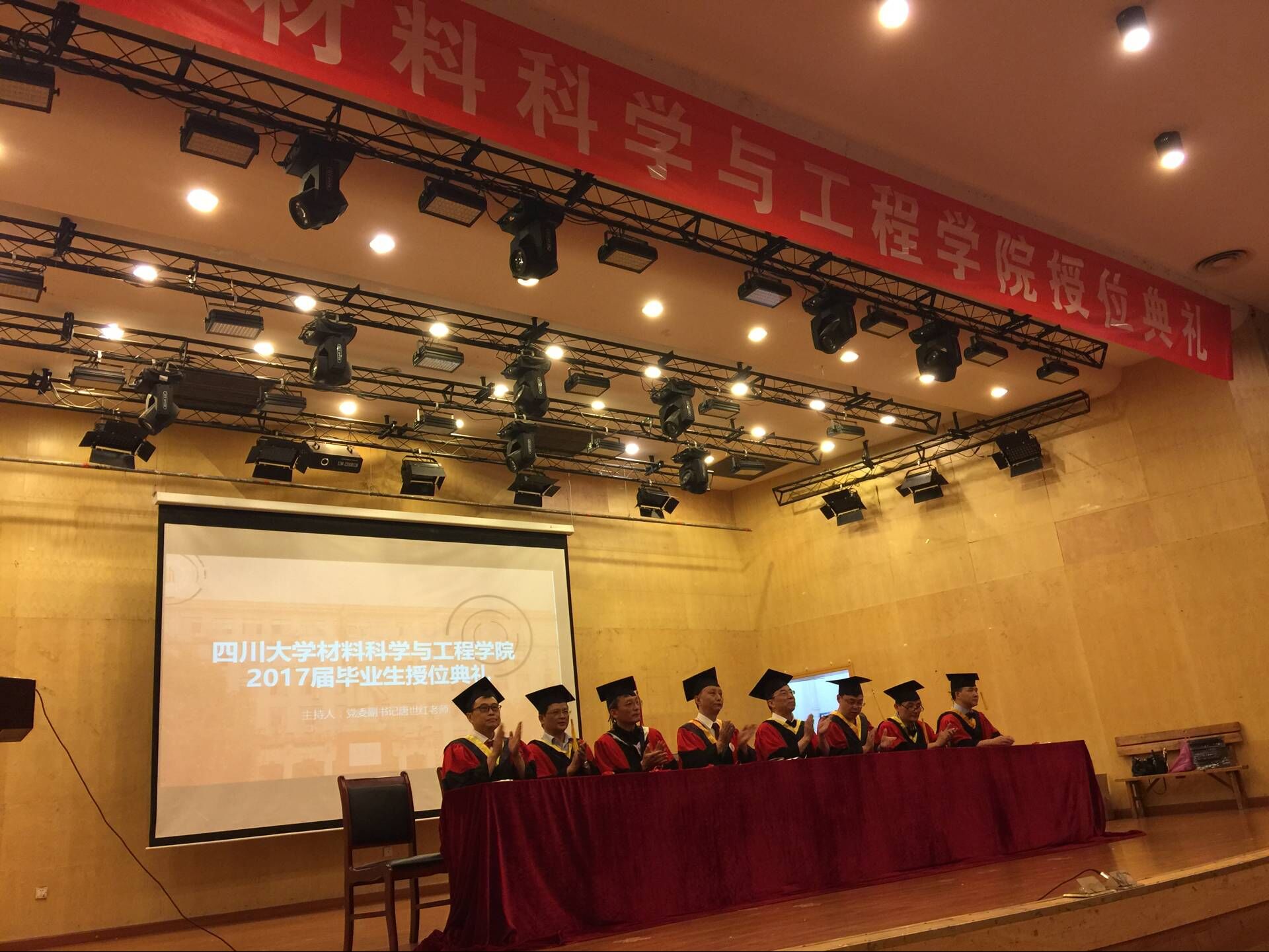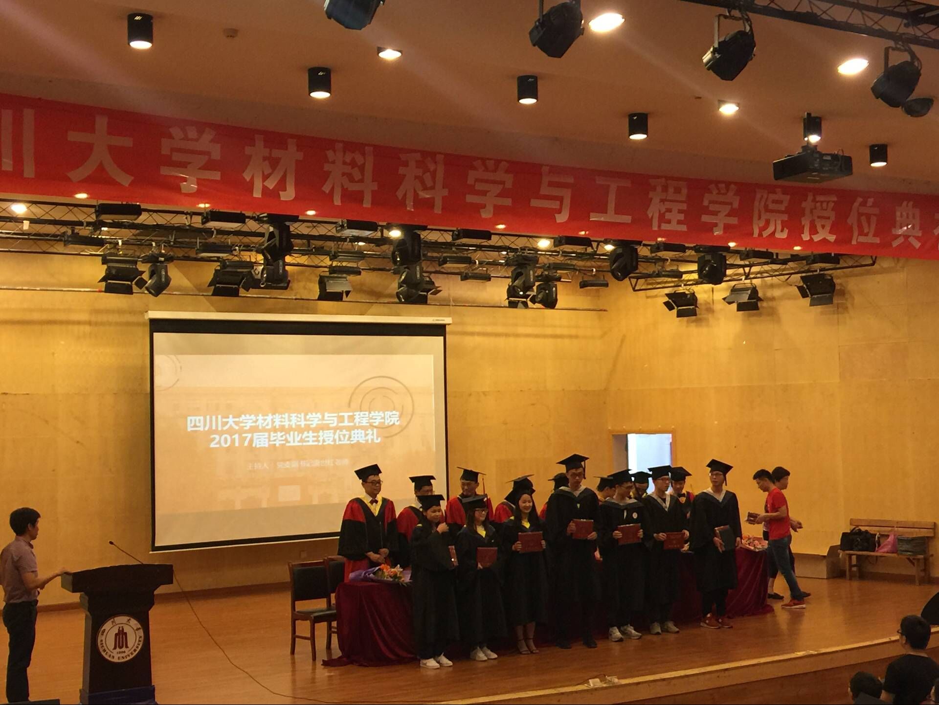 2017年6月12日上午8:20,在文华活动中心二楼音乐演播厅举行了2017届材料科学与工程学院毕业典礼。材料科学与工程学院院长尹光福教授、党委书记朱建国教授、副院长刘颖教授、工会主席周大利教授、副院长孙小松教授、党委副书记唐世红老师、新能源系主任陈云贵教授、材料科学系主任张静全教授、无机生医系党支部书记黄忠兵教授等诸位领导、老师,2017届博士、硕士以及学士共356名毕业生齐聚一堂。典礼由材料科学与工程学院党委副书记唐世红老师主持。院长尹光福教授发表了满怀深意的讲话,向所有毕业生表达了殷切的期望和浓浓的祝福。党委书记朱建国教授宣读了2017届省级校级优秀毕业生优秀学生干部的表彰决定,向2017届的优秀毕业生们表示了真挚的祝贺。教师代表张静全教授代表全体教职工向材料学院全体毕业生表达了深切的祝愿。随后2013级本科毕业生王倩同学代表全体毕业生发表了主旨为“知识与担当”的演讲。最后是毕业典礼授位仪式,老师们将毕业证书和学位证书一一交到同学们手中,并对同学们表示祝贺。2017届毕业典礼在同学们的高兴与不舍中落下了帷幕。
