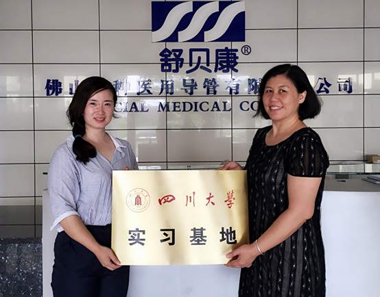 图3.带队老师向佛山导管公司授于“四川大学实习基地”铜牌,以感谢该公司对我们川大生物医学工程专业实践活动的一贯支持和帮助。