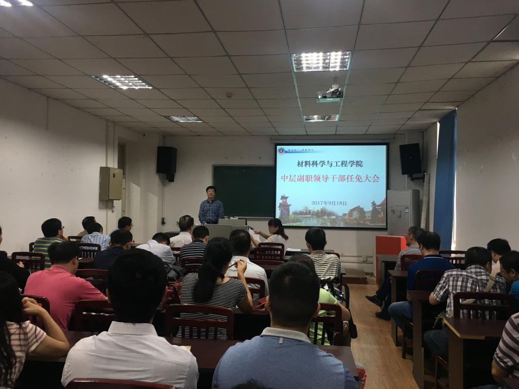 受四川大学党委委托,李旭锋教授宣布了四川大学党委关于材料科学与工程学院副院长、党委副书记职务任免的决定,聘任吴家刚同志、林江莉同志为材料科学与工程学院副院长,免去唐世红同志材料科学与工程学院党委副书记及孙小松同志材料科学与工程学院副院长的职务,唐世红同志暂时代理学院党委副书记的工作。