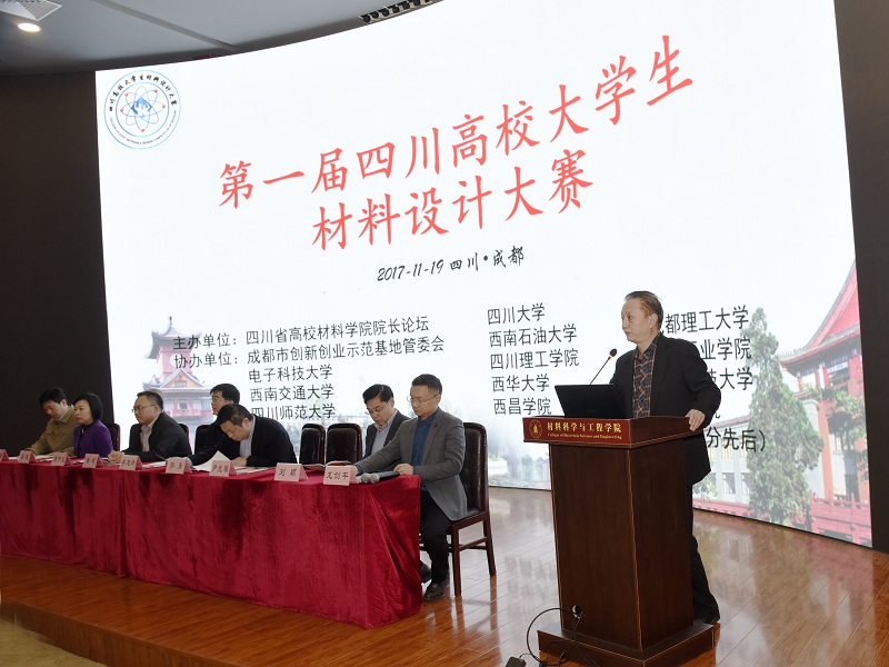 2017年11月19日星期日,第一届四川高校大学生材料设计大赛开幕式在四川大学望江校区逸夫科学馆顺利展开。本次比赛由四川大学主办,电子科技大学、西南交通大学等12高校与成都市创新创业示范基地管委会共同协办,并由菁蓉镇管委的大力支持,旨在加强材料工程的学科建设和增强大学生创新实践能力。