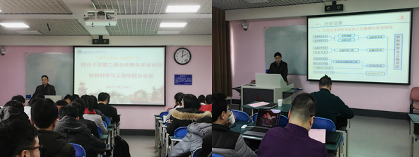 四川大学第二届材料学院青年学者分论坛于2017年12月20日下午14点在望江校区东三教313教室举行。此次论坛特邀请了8位来自海内外的优秀青年学者作了一场精彩绝伦的学术报告。论坛由材料学院书记尹光福教授主持,学院院长刘颖教授和林江莉副院长以及系主任、师生职工100余人参加了论坛。