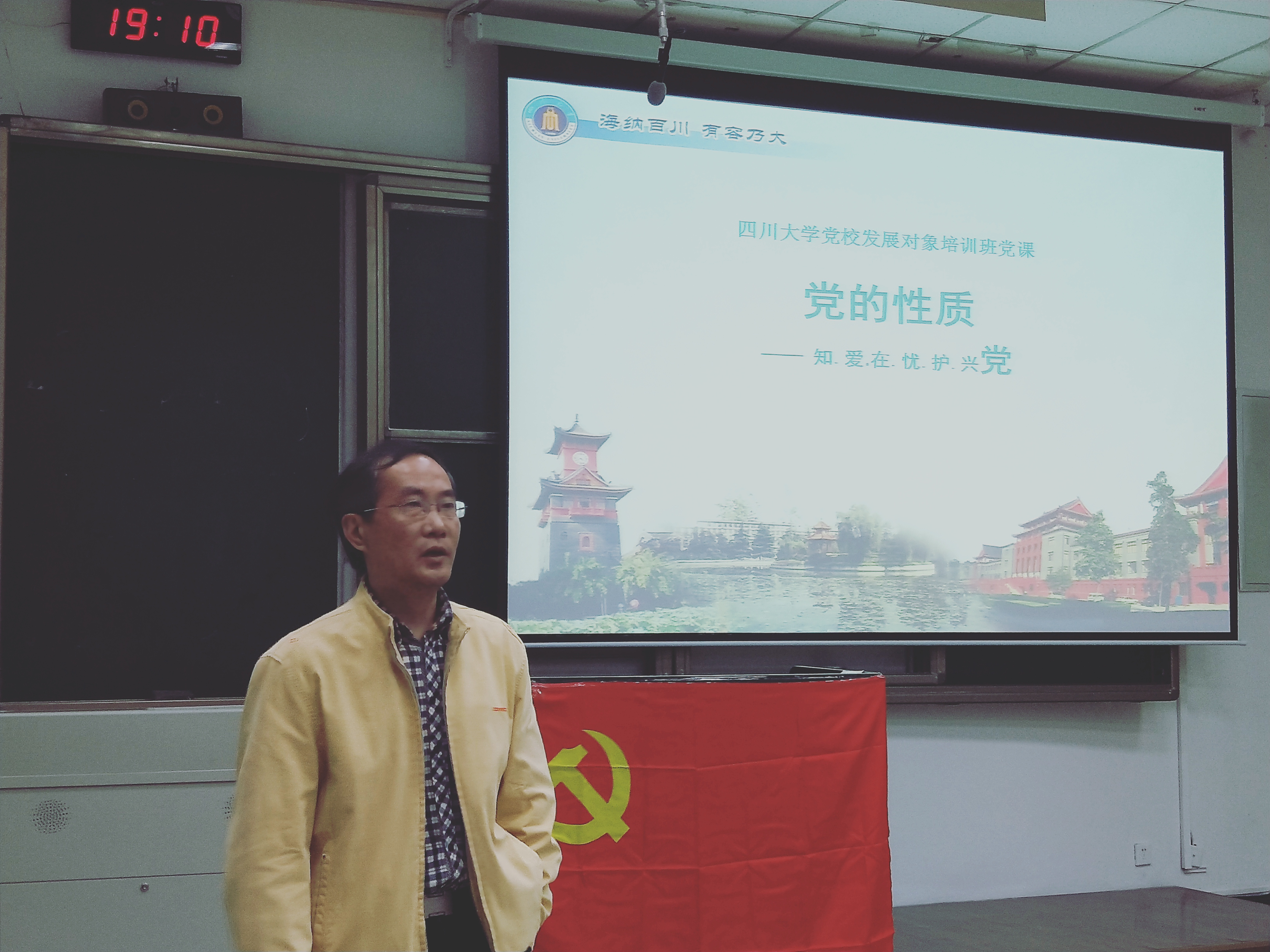 随后,四川大学党校常务副校长范嗣云教授以《党的性质——知、爱、在、忧、护、兴党》为题开始第一次授课,由韩纪梅副教授主持。范老师向学员们详细讲述了党的诞生和发展、党章的发展和表述、党的性质;在如何践行党的性质等方面,范老师列举大量事实、旁征博引,并联系当代大学生的生活、思维和当代社会的热点新闻事件,深入解析了共产主义运动的发展史、党的核心思想以及学生入党的最终目的。
