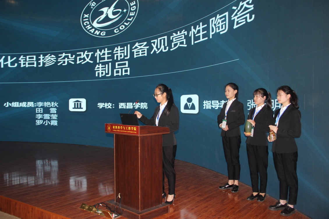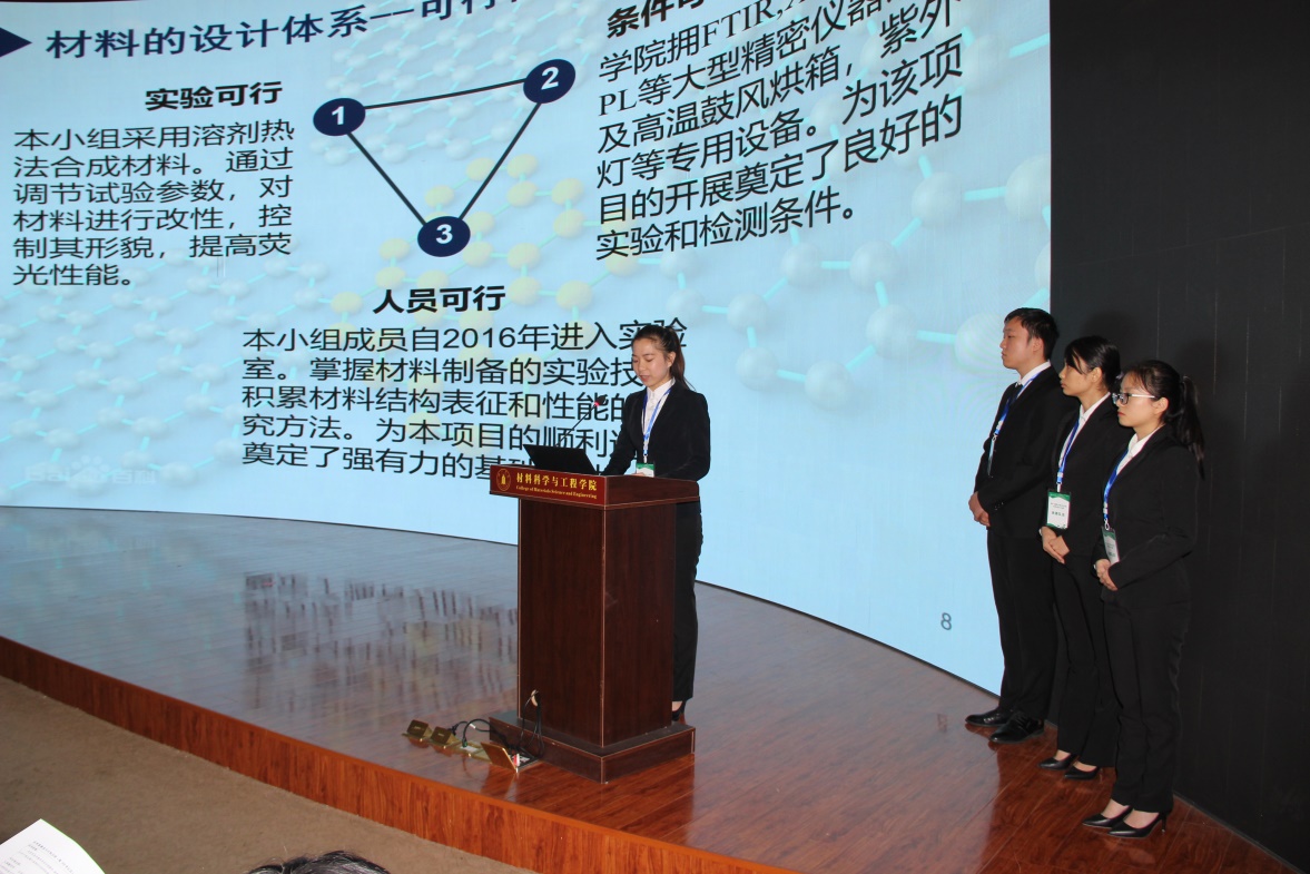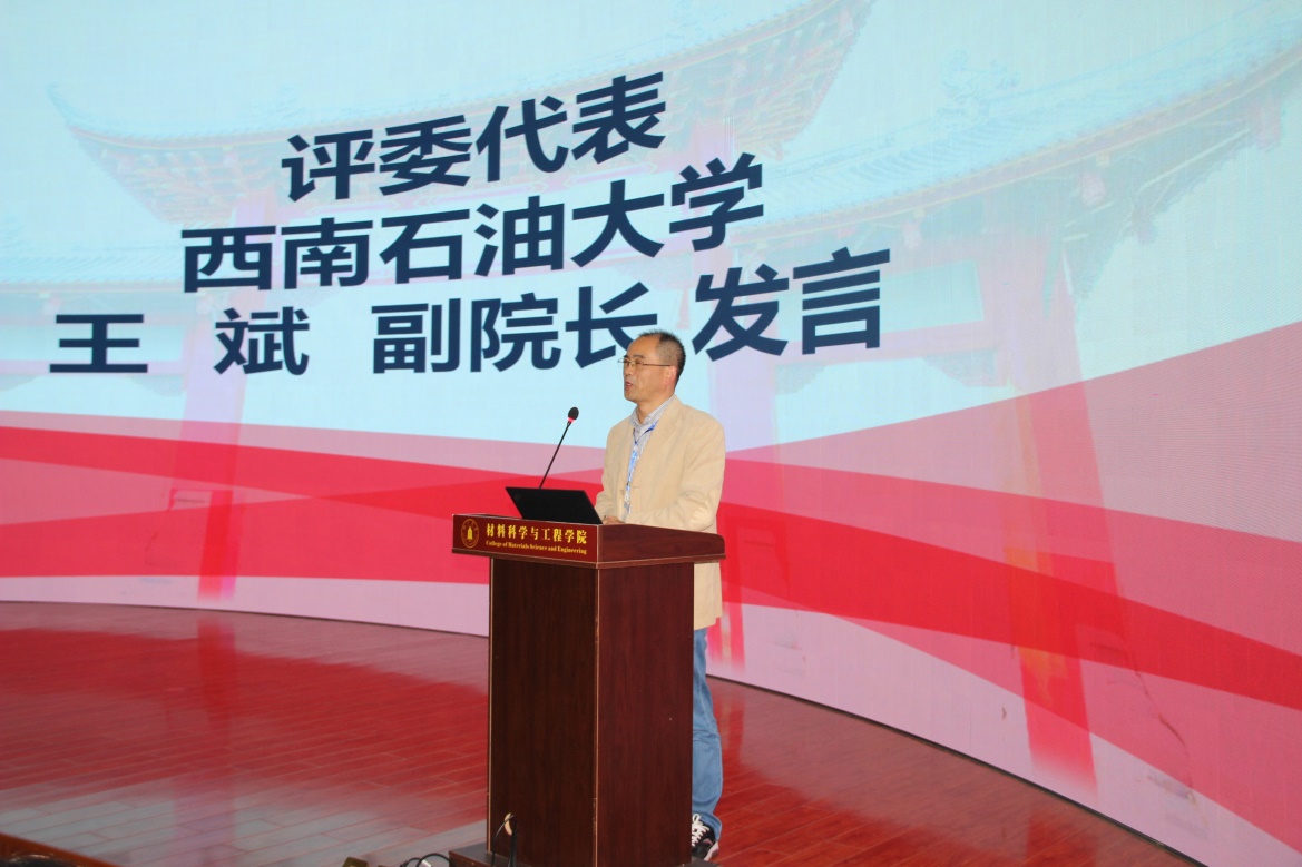 开幕式结束后,比赛正式开始。来自省内十二所高校的28个队伍依据抽签顺序依次向大家详细讲解了他们设计的材料。评委老师们对参赛队伍给出了自己的点评和意见,进行深入的提问,并按评审细则进行了严格打分。各参赛队的展示可以说是百花齐放,有的以“农业废品”秸秆为原材料来设计新型材料;有的设计了新的材料将其应用于精美的新型陶瓷工艺品;有的同学制备的材料不怕破坏,拥有“自我修复”的能力;还有的同学创造出了可以用于疾病治疗能减少毒副作用的新材料。比赛氛围激烈而精彩纷呈,评委和选手的互动充满了智慧的碰撞。现场观众既看到了各参赛队的精彩讲述,也看到了部分参赛队带到现场的精美样品,更是从评委老师的提问中学习到了更深刻的理论和实践知识。其中,来自四川大学的金泓宇团队的参赛项目——“Gemac纳米给药系统”,西华大学的黄敬鉥团队的参赛项目——聚丙烯中β型杂化串晶自增强相的构建与应用,以及西南交通大学的盛世雨团队的参赛项目——肝素功能化粘附分子对血管支架材料表面改性设计等项目,讲解条理清晰,富有激情,受到了评委老师们的一致好评。整场比赛耗时近七个小时,所有参赛队展示结束后,大赛评委代表,西南石油大学王斌副院长发言。王斌副院长表扬了参赛队伍同学们优秀的团队协作和创新能力。并代表所有老师,希望同学们在交流学习中,汲取精华,为未来的成长奠定基础。