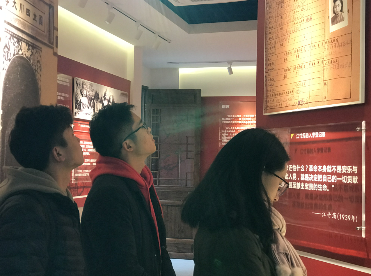 2018年12月21日,2018级硕士党支部来到江姐纪念馆,开展以江姐革命事迹与革命精神的红色主题教育宣传活动。讲解员为大家生动还原了江姐在川大读书期间的生活等方面,通过图片以及珍贵档案等形式,真实还原了学生时代的江姐形象,以及她的人生经历。