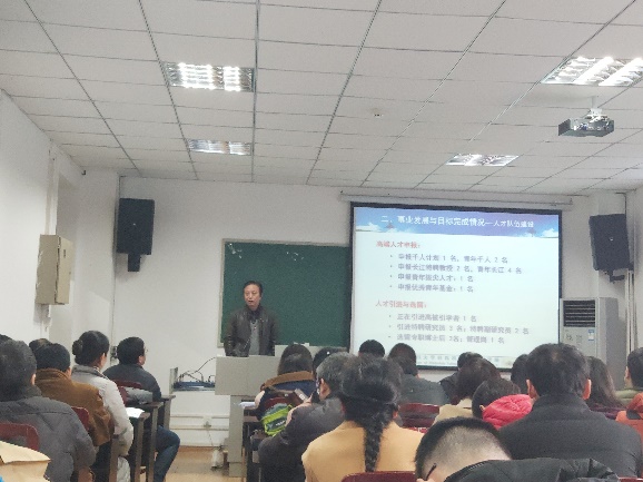 会议伊始,尹书记代表学院党政向学院全体教职工介绍了我院2018年的工作情况。尹书记指出在学校党政的领导下,根据学校的总体部署,学院以围绕中心抓党建、抓好党建促发展为工作核心,积极推进校院两级管理体制的改革,探索学院发展的新思路,以找差距、明目标、定举措、抓落实为工作准则,在全院师生的共同努力下,在建党工作取得显著成效的同时,也实现了事业的快速发展,为“双一流”建设开启了良好的开端。在介绍完我院2018党建工作与贯彻执行情况、事业发展与目标完成情况、标志性贡献及创新新成果后,尹书记总结到,2018年是我院新一届领导班子上任的第一年,也是“双一流”建设的开局之年,学院取得的成绩离不开全院师生大力的支持和积极的配合,2019年希望大家能团结一心,砥砺前行。随后,尹书记指出校园两级管理体制改革和专业整合调整是学院面临的两大任务,同时也是学院发展的机遇,我们一定要抓住机遇,结合学院的特色和优势,整合力量,凝练方向,建设具有中国特色、川大风格的一流学科和一流学院。