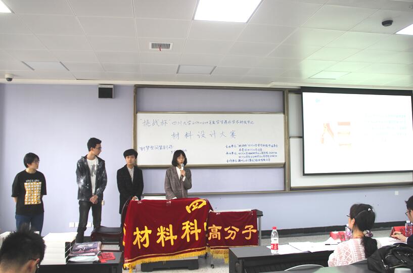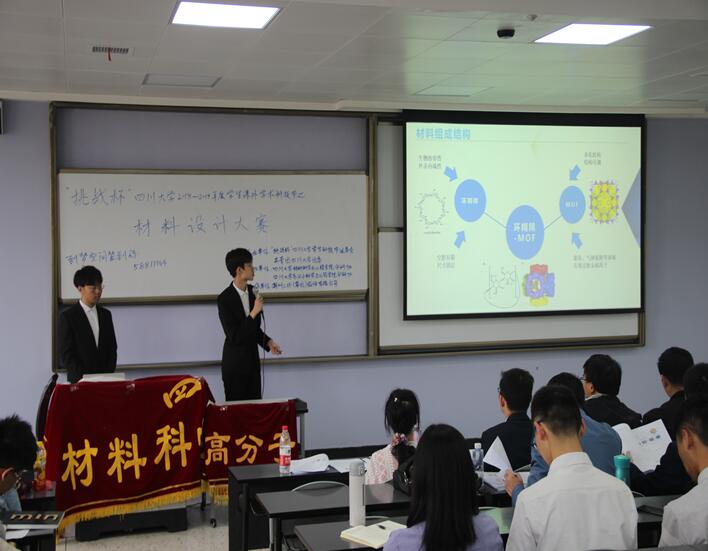 决赛共有十一支队伍参加,评委嘉宾由高分子赵伟锋教授,材料学院林紫锋研究员,杨为中教授,吴朝玲教授共同担任,嘉宾为党委副书记张晓满教授以及潮州三环经理梁明川。在比赛进行过程中,参赛队伍轮流上台展示自己小组的制作成果,展2019年4月12日,由“挑战杯”四川大学2019年学生科技节组委会、共青团四川大学委员会主办、由四川大学材料科学与工程学院分科协,四川大学高分子科学与工程学院分科协以及四川大学制造科学与工程学院分科协共同承办的“挑战杯”四川大学2018-2019年度学生课外学术科技节活动之材料设计大赛在四川大学江安校区一教B座205顺利举行 。