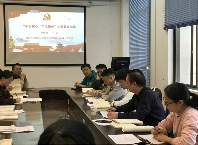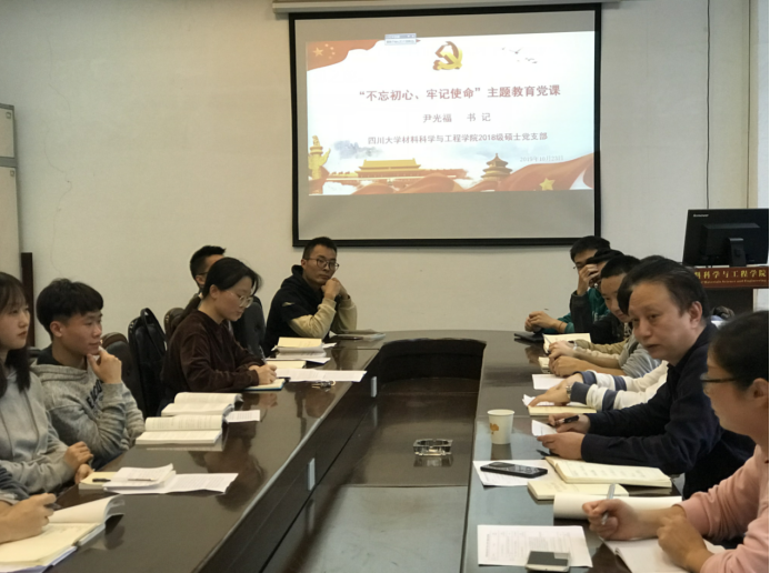 为深刻学习领会“不忘初心、牢记使命”主题教育相关精神,扎实推进学院主题教育工作,10月23日三点,材料院党委书记尹光福教授开展了学习贯彻 “不忘初心、牢记使命”主题教育专题党课。学院支部书记余艳丽老师、2018级全体硕士党员同志参加学习。