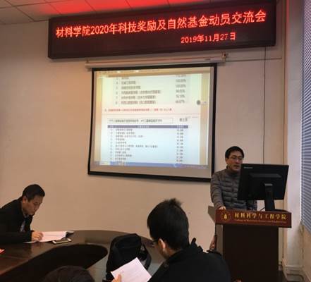 2019年11月27日,“材料科学与工程学院2020年度科技奖励和自然基金动员交流会”在望江校区第一理科楼会议室举行。学院相关教师30余人参加了会议,会议由吴家刚副院长主持。