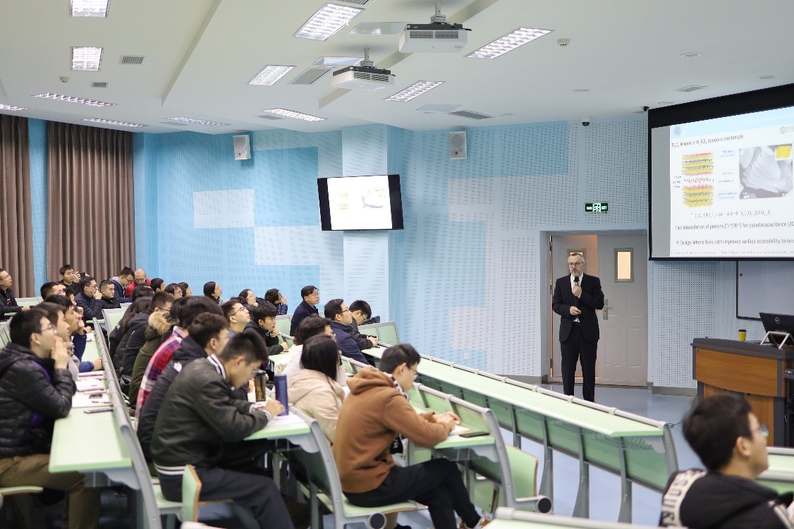 四川大学材料科学与工程学院院长刘颖教授为Patrice Simon教授颁发了特聘院士聘书。接受聘书后,Patrice Simon教授作了题为“Electrochemistry at nanoscale: understanding ion adsorption/transfer in supercapacitor electrodes”的学术报告,介绍了多孔碳与赝电容材料的研究现状及所面临的挑战。首先讲解了碳材料孔结构与电解液离子尺寸效应,阐明了合理选择电解液离子尺寸及设计多孔碳结构的重要性。此外,Simon教授介绍了具有赝电容行为的氧化物和二维过渡金属碳化物(MXene)的电化学行为,并阐述了赝电容电极材料的重要发展潜力。Patrice Simon教授深入浅出的讲解了超级电容器及电池储电机制,让到场师生受益匪浅。报告结束后,在场师生与Simon教授积极互动,对相关科学问题进行了深入探讨。