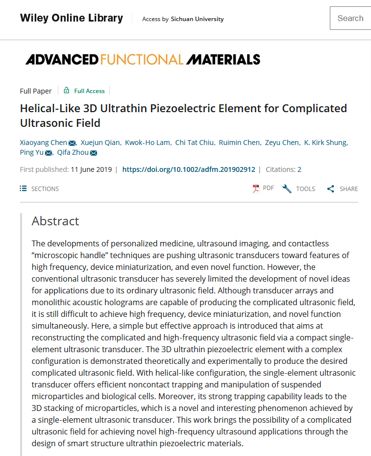 近日,材料科学与工程学院余萍教授团队,与美国南加州大学、香港理工大学合作的“使用3D复杂结构的超薄压电敏感元来构建超声复杂声场的研究”课题相关成果,在国际著名材料期刊Advanced Functional Materials (IF=15.621)以原创性论著形式发表。该工作针对当前超声技术发展的趋势:新功能、高频以及器件微型化,首次提出利用复杂3D结构的超薄压电敏感元实现复杂的高频超声场。论文第一作者是材料学院专职博士后陈潇洋,材料学院余萍教授和美国南加州大学周岐发教授为共同通讯作者。四川大学为该论文的第一署名单位。
