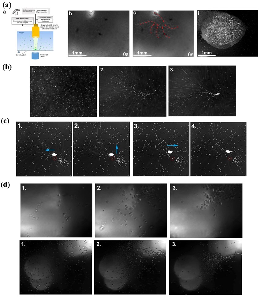 通过该压电敏感元设计超声换能器发射出了类似漩涡的高频声场,该声场不同于常规声场,可以将微米级微粒包括悬浮微粒在内,吸入到聚焦区域进行密堆积,并且可以对收集的微粒群进行二维操纵。不仅能够对无机的微粒进行收集及移动操作,而且可以快速集中分散在溶液中的生物细胞,如图3所示。该研究对发展高效的生物无损检测技术提供了支持,并为发展新型的高频复杂声场提供了新的研究途径。