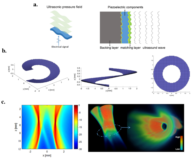 压电材料最重要应用之一就是超声换能器,超声换能器是超声技术应用的核心器件。特别是医学诊断、治疗及生物医学研究对精细成像、精准定位及生物组织内微粒操纵等方面的技术需求,促使超声换能器正向着高频甚至超高频、微型化及新功能的方向发展。近年来,基于3D打印技术发展的声学全息技术、声学超材料以及基于复杂算法的阵列技术使得超声波应用技术有了新的突破。这些新兴技术都涉及了一个关键点,构建新型复杂的三维声场。采用阵列技术的关键是需要研制出复杂的电学处理系统,而这个过程是非常耗时并且成本较高。相比压电阵列敏感元,采用3D打印技术可以快速有较的直接打印出具有复杂形状的声学镜头,利用镜头上每一点厚度的不同实现声场相位的差异,所获得的复杂声场的分辨率要远高于使用压电阵列敏感元的方法,但目前这项技术的关键点在于3D打印技术可提供的分辨率。目前上述两种技术都没办法很好同时实现复杂声场,高频以及微型化。该研究首次提出,使用复杂 3D 结构的超薄压电敏感元来实现高频复杂声场。自然界的漩涡是一种很复杂的运动,漩涡的特点是中心压力低,并且能产生很大的吸力将周围的物体快速吸引到漩涡中心。作者根据漩涡运动的特点,设计了三维螺旋状的超薄压电敏感元,如图2所示。