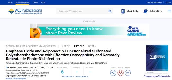 近日,我院杨为中教授与四川大学化工学院邓怡副研究员、西南医科大学以及澳大利亚南昆士兰大学合作,在生物材料表界面工程工作取得进展,相关研究成果“Graphene Oxide and Adiponectin-Functionalized Sulfonated Polyetheretherketone with Effective Osteogenicity and Remotely Repeatable Photo-Disinfection”以四川大学材料科学与工程学院为第一单位发表在材料类著名期刊《Chemistry of Materials》(中科院一区,影响因子10.159)。四川大学材料科学与工程学院2016级本科生高翔宇同学(论文第二作者)依托国家级大学生创新创业计划项目主要参与了本论文工作,并在细胞实验、抗菌实验及部分数据处理工作上做出了贡献。