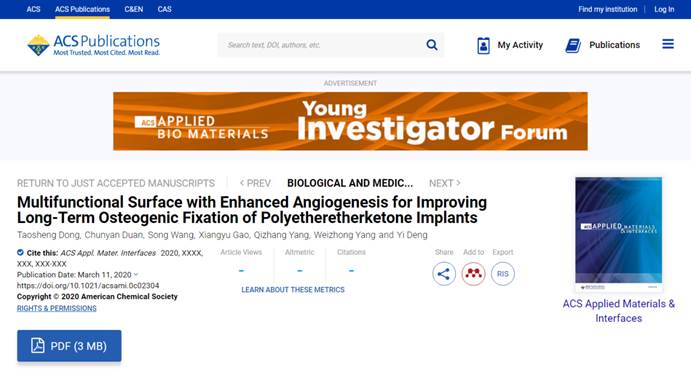 近日,我院杨为中教授团队与四川大学化工学院邓怡副研究员及西南医科大学合作在生物材料表面功能化修饰领域取得一定进展,研究成果“Multifunctional Surface with Enhanced Angiogenesis for Improving Long-Term Osteogenic Fixation of Polyetheretherketone Implants”发表在材料科学领域著名期刊ACS Applied Materials & Interfaces(中科院一区,影响因子8.47)上。第一作者为2018级硕士研究生董涛生同学,2016级本科生高翔宇以及2017级本科生杨骐彰参与了部分工作。