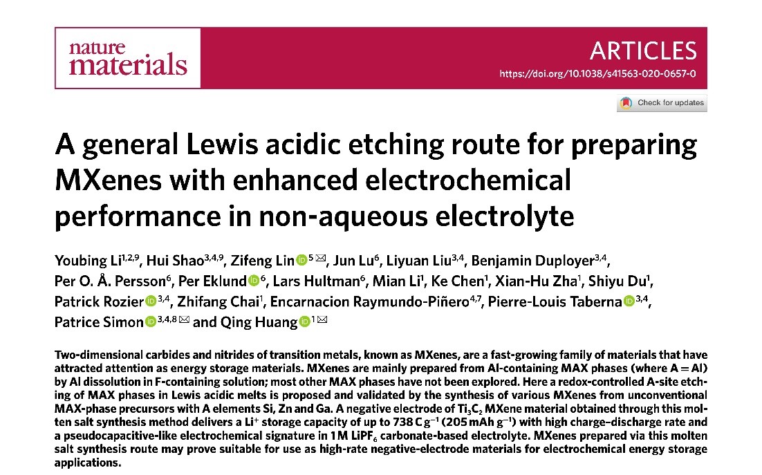 近日,我院稀土钒钛材料中心林紫锋特聘研究员与四川大学特聘院士、法国科学院院士、法国科学技术学院院士及欧洲科学院院士、法国图卢兹大学Patrice Simon教授以及中国科学院宁波材料所黄庆研究员合作,在钒钛基二维MXene材料制备及电化学储能研究方面取得重要进展,相关成果在Nature Materials以原创性全文形式发表。林紫锋特聘研究员为论文共同通讯作者,四川大学材料科学与工程学院为共同通讯单位。