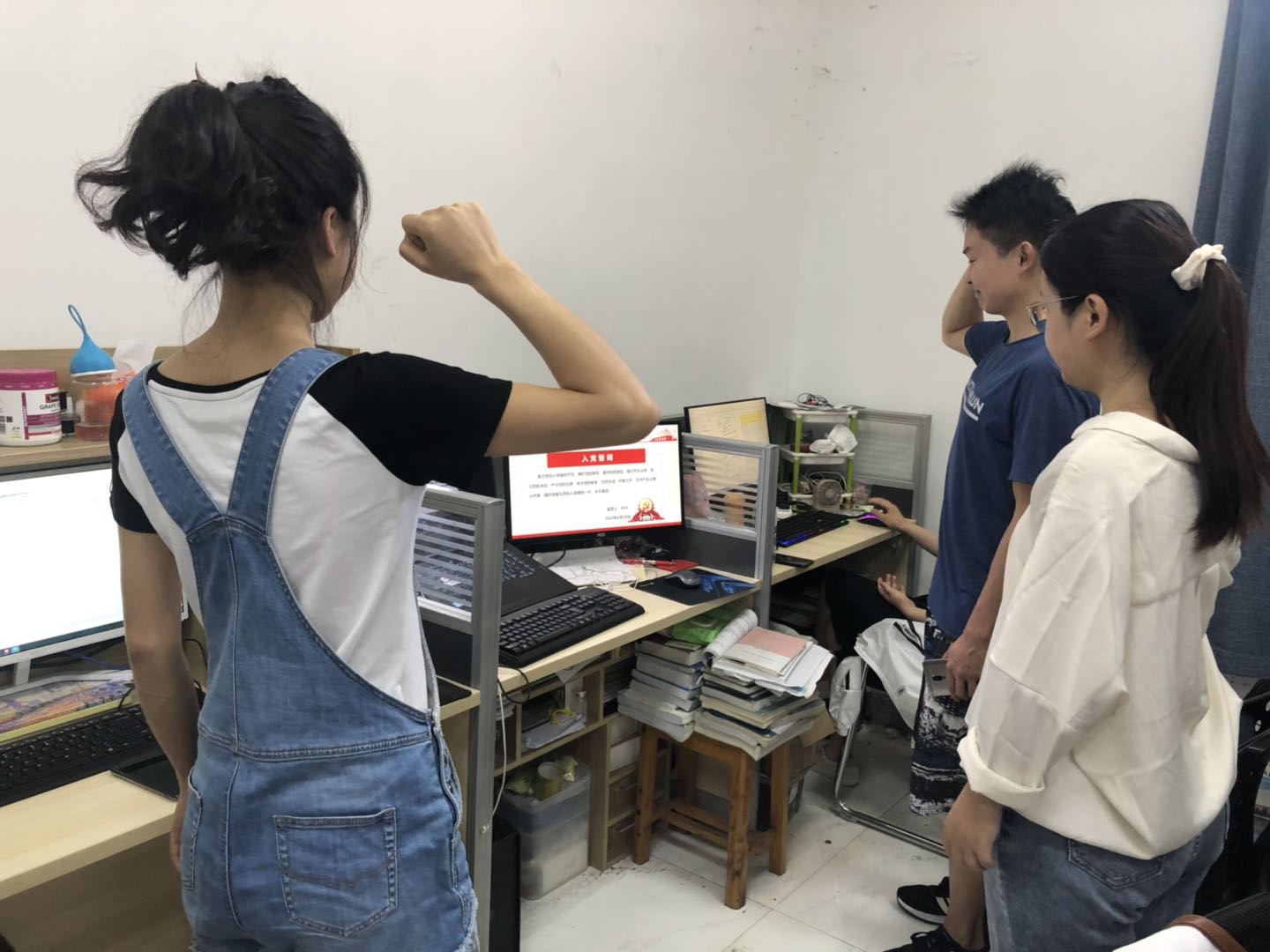 支部成员首先纷纷讲述身边的抗疫故事。黄艳莉讲述了自己表哥在交警的岗位上,坚持把人民群众生命安全和身体健康放在第一位,充分发挥党员先锋模范作用的事迹。孔鹏飞以自己年迈的爷爷在疫情中的经历,讲述了在这次抗疫的过程中,举国上下人民群众团结一致众志成城,战胜疫情的坚定信念。张照从自己海外留学的经历谈起,转述境外留学生朋友在疫情中感受到的党和祖国的温暖。其他同学也纷纷发言,大家都深刻领悟到中国共产党“为人民谋幸福”的初心使命,“人民至上,生命至上”的价值追求。全体老党员重温入党誓词,新党员进行入党宣誓之后,同学们纷纷表决心:将以一线抗疫工作者为榜样,刻苦学习,增强本领。疫情终将被战胜,我们要积极行动起来,为党的伟大事业而努力奋斗!