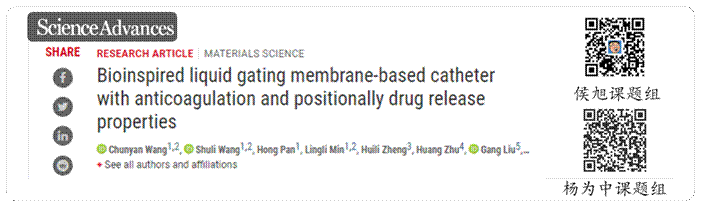 2020年9月5日,我院杨为中教授与厦门大学侯旭教授团队合作,在Science子刊《Science Advances》上合作发表了题为“Bio-inspired Liquid Gating Membrane-based Catheter with Anti-coagulation and Positionally Drug Release Properties”的论文,提出了具有自适应性形变、抗凝血、定点药物释放功能的液体门控医用导管机制。论文第一作者为四川大学材料科学与工程学院2018届优秀毕业生、现厦门大学化学化工学院2018级直博生王春燕。厦门大学侯旭教授和四川大学杨为中教授为论文共同通讯作者。