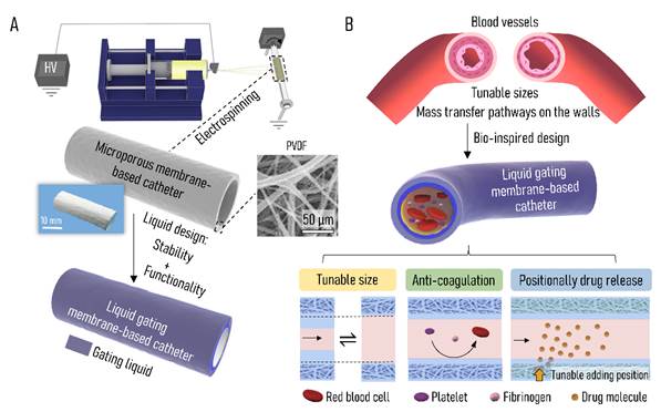 医用导管是插入体内的柔软管道,用于液体引流或微创式医疗器械植入。现有的医用导管有包括用于血液透析的血透管、用于心血管支架等植入的球囊导管以及导尿管等。其主体管道,主要是用聚氨酯、硅橡胶等医用高分子制成的实体管道,以供物质从端口进入从末端输出。这样的医用导管存在一定的局限性,包括无法与植入环境进行互动,缺乏环境适应性;功能性单一以及因外界材料植入引起的血栓、感染等问题。基于此,厦门大学侯旭教授团队与四川大学杨为中教授团队合作提出了一种液体门控医用导管,以赋予医用导管环境响应性的动态变化、抗凝血以及定点药物释放功能。