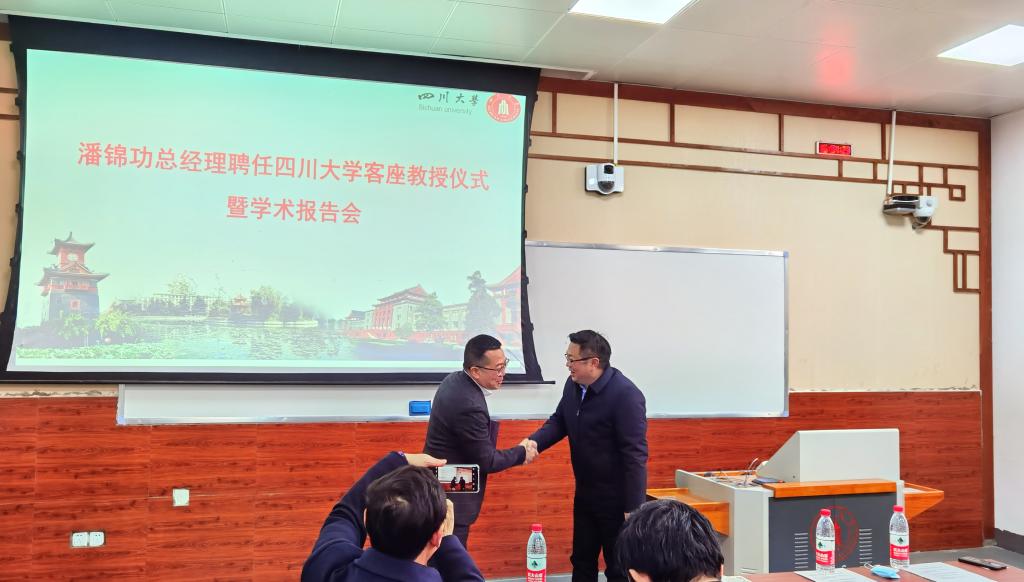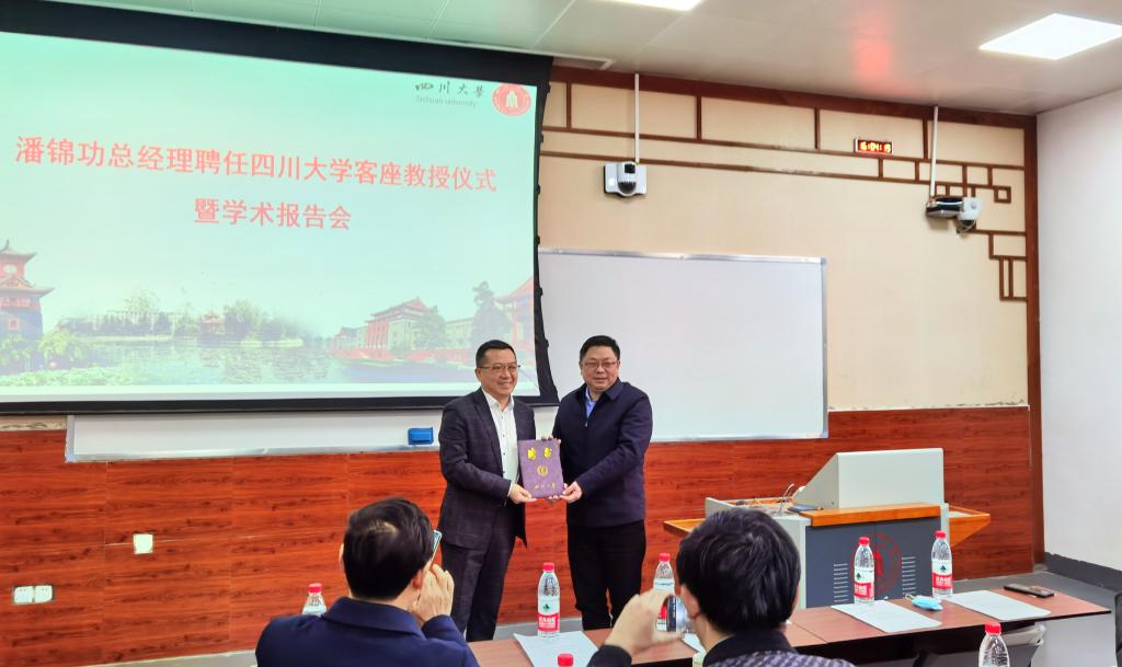 授聘仪式上,蒋青书记首先对潘锦功总经理的到来表示热烈的欢迎。四川大学党委副书记郭勇教授为潘锦功总经理颁发聘书,与会领导、教授与潘锦功总经理合影留念。