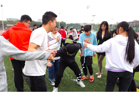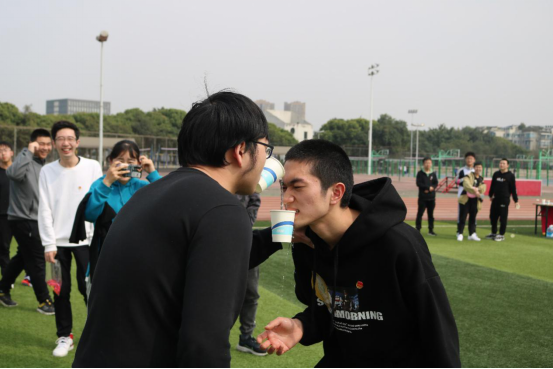 精彩不断,游戏不停。“游戏接龙”是本次活动的重头戏。“游戏接龙”由三部分组成——“转布条”、“杯水车薪”、“运气球”。 “转布条”相当考验两名队员的默契度,要求一松一紧频率同步才能成功接力,一个个高速旋转的“小陀螺”让人瞠目结舌。“杯水车薪”无疑是本场游戏的难点和爆笑点,咬紧牙关、纸杯的倾斜以及身体的协调,过程曲折但气氛愉快。运气球的两名队员背靠背夹住气球接力奔向终点,尽己所能为小组拿分。在紧张刺激的游戏中,学员们不仅收获了快乐,同时也培养了沟通和协作的能力。