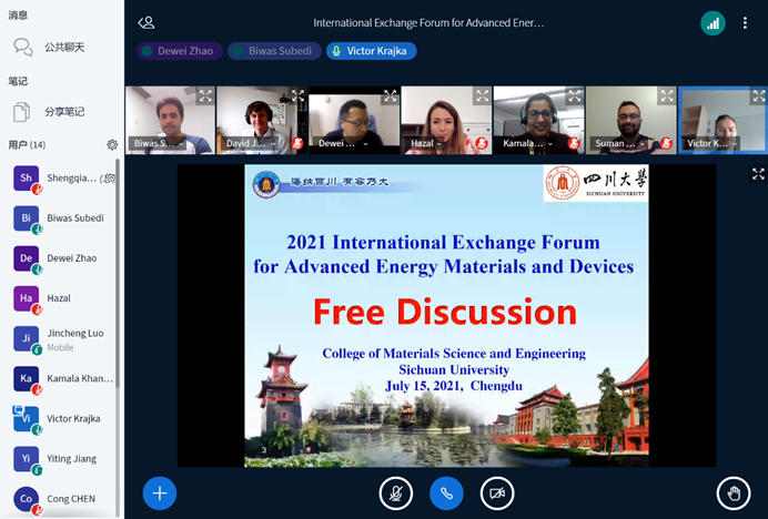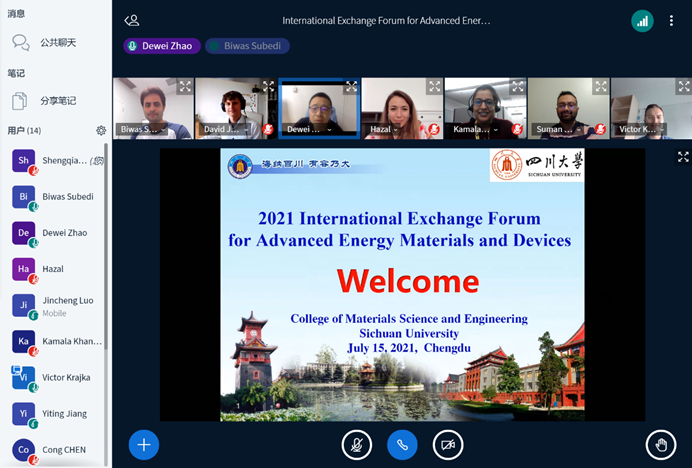 2021年7月15日21:00-23:00,由材料科学与工程学院赵德威特聘研究员主持,同时邀请到了来自美国和德国的共6位国际学生和学者,与四川大学材料科学与工程学院数名师生一起开展了“International Exchange Forum for Advanced Energy Materials and Devices”的国际学生交流活动。由于疫情影响,本次活动采取线上会议的形式进行。