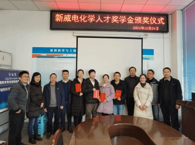 2021年12月24日,“四川大学-新威尔电化学奖学金”颁奖仪式在第一理科楼209会议室召开。该奖学金是由深圳市新威尔电子有限公司在四川大学设立的专项奖学金,主要用于奖励四川大学新能源材料与器件专业的优秀博、硕士研究生和本科生。颁奖仪式由材料学院新能源材料与器件专业教学研究中心主任张云主持,新威尔电子有限公司副总经理秦军、材料学院党委副书记兼纪委书记张晓满、学院分团委书记兼博士党支部书记王娇老师和新能源材料系部分老师参加了颁奖仪式。秦经理表示,奖学金的设立是为了回报社会,希望同学们专注电化学领域的科研工作,为国家新能源产业发展奉献自己的一份力量;张晓满书记首先感谢新威尔公司设立了奖学金,表示要响应国家号召,校企联合大力发展新能源事业。