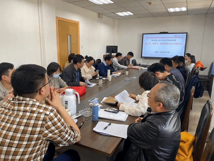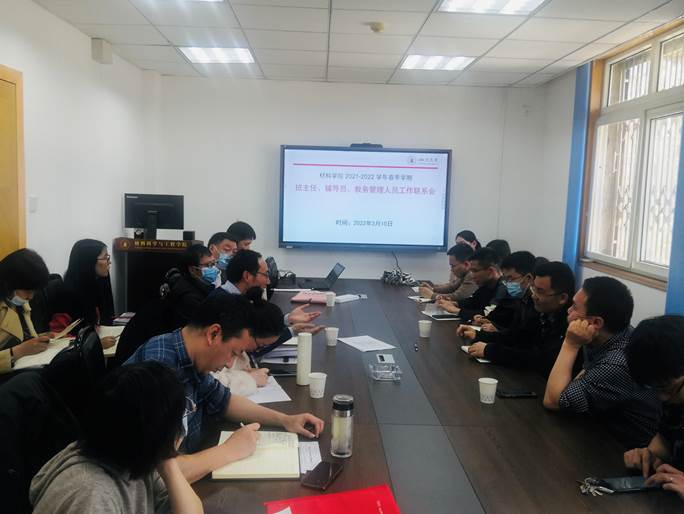 开学伊始,为贯彻全国高校思想政治工作会议精神,强化立德树人工作,更好发挥教师对学生发展、成长成才的指导作用,提升班级管理水平,增强班级管理工作的针对性和时效性, 3月10日下午3:00,材料科学与工程学院新学期班主任、辅导员、教务管理人员工作联系会在学院会议室召开,党委副书记张晓满教授,副院长叶金文教授,2020级和2021级班主任、辅导员、教务员参加了此次工作会,会议由叶金文教授主持。