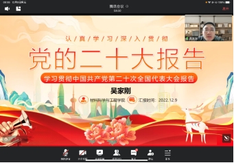 为深入学习贯彻党的二十大精神,四川大学材料科学与工程学院本科生望江党支部于2022年12月09日上午10时,在腾讯会议平台开展了党的二十大报告学习活动,学院吴家刚副院长莅临现场进行宣讲。