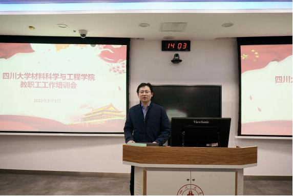 3月3日下午,材料科学与工程学院召开教职工工作培训会,学院邀请校纪委副书记唐世红作廉政教育报告,邀请校财务处副处长王娟和相关工作人员作经费管理使用及财务报销宣传,邀请院中心实验室王文武作实验室安全教育宣讲,学院院长刘颖、党委书记徐海鑫等全体领导班子及全体教工参加培训学习。会议由党委书记徐海鑫主持。