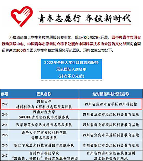 日前,团中央青年志愿者行动指导中心、中国青年志愿者协会秘书处联合中国科学技术协会宣传文化部面向全国高校遴选300支大学生科技志愿服务示范团队,我院的四川大学材料科学与工程科技志愿服务团队成功入选。
