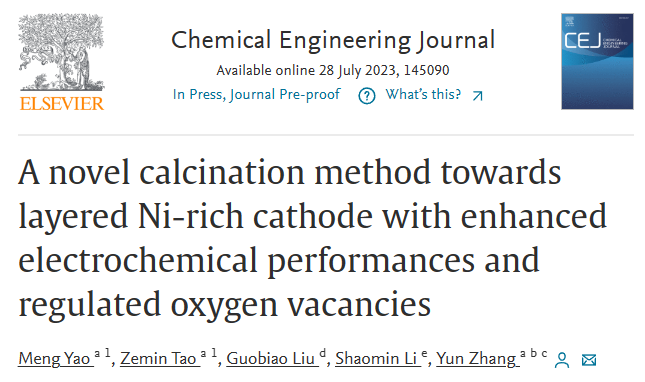 在锂离子电池高镍三元正极材料方面,通过采用氧化剂Li2O2代替锂源LiOH·H2O,使用一种新的煅烧方法制备了具有降低的氧空位和较低的Li+/Ni2+阳离子混合的LiNi0.9Co0.05Mn0.05O2正极材料。在这项工作中,详细讨论了Li2O2在富镍材料煅烧阶段结构演变中的作用,相关成果发表以“A novel calcination method towards layered Ni-rich cathode with enhanced electrochemical performances and regulated oxygen vacancies”为题,发表在著名学术期刊Chemical Engineering Journal上(中科院一区,川大B刊,影响因子15.1)。四川大学为该论文第一通讯单位,第一作者是尧猛副研究员和四川大学2020级硕士研究生陶泽敏,通讯作者为四川大学张云教授。