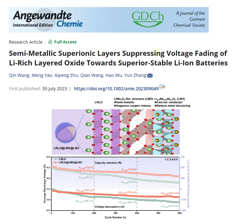 锂离子电池富锂锰基正极材料的研究工作以“Semi-Metallic Superionic Layers Suppressing Voltage Fading of Li-Rich Layered Oxide Towards Superior-Stable Li-Ion Batteries”为题,发表在Angewandte Chemie上(中科院一区,川大A−期刊,影响因子16.6),四川大学为该论文第一通讯单位,第一作者是四川大学2021级硕士研究生王勤和尧猛副研究员,通讯作者为四川大学张云教授。
