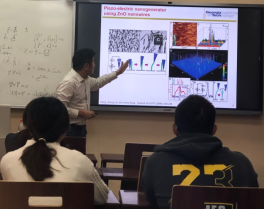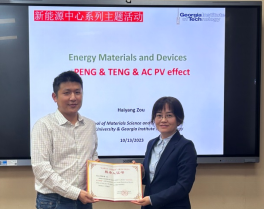 主题党日活动结束后,中心特别邀请邹海洋老师做了关于“Energy Materials and Devices-PENG&TENG&AC PV effect”的交流报告。邹老师介绍了包括压电纳米发电机、摩擦纳米发电机、压电光电子学以及交流光伏效应的物理机理,同时详细阐述了在这些领域中的科研动态和前沿科研成果以及相关技术在健康状态实时监测和智能医疗诊断等领域的应用。报告结束后,与会老师进行了广泛的学术讨论。本次学术交流活动,是新能源中心“永远跟党走,建功新能源”主题学术交流系列活动之一。
