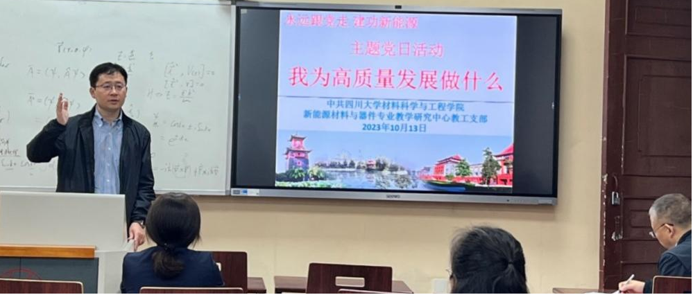 10月13日新能源材料与器件教工支部开展了“我为高质量发展做什么”主题党日活动,活动由党支部书记曾广根同志主持。与会党员老师首先集中学习,随后围绕 “我与高质量人才培养和科学研究”、“高质量发展与我”等话题进行研讨。徐海鑫书记强调,党员老师要针对教学科研特点进行大思考大讨论,要明确在高质量发展中的自我定位和职责任务,充分激发党员在建功新能源上发挥积极主动的先锋模范作用;要提振党员教书育人的精气神,强化基层党支部战斗堡垒作用,通过“永远跟党走,建功新能源” 党建品牌的创建,切实推动以高质量党建引领保障高质量发展。