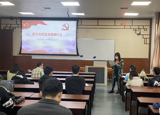 11月10日下午,材料科学与工程专业教工支部开展了“我为高质量发展做什么”主题党日活动,活动由党支部书记连利仙同志主持。与会党员老师首先集中学习,然后围绕推动“三个一流”建设、人才自主培养质量、打造高水平师资队伍、服务高水平科技自立自强等重点工作,深入开展研讨。朱建国教授特别为青年教师传授宝贵的教学经验,建议青年教师选好高质量教材、认真准备课件和讲义、有效组织课堂教学,积极深入经验丰富或教学效果好的课堂观摩学习,不断提高教学质量。