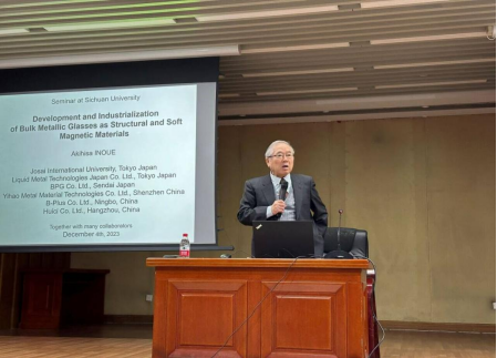 在杨磊副教授隆重介绍井上明久教授后,讲座正式开始。井上明久教授首先表示自己已是第七次来到成都,很荣幸受邀来到四川大学材料科学与工程学院进行学术分享,并高度赞扬了学校的办学条件和教育水平。随后,井上明久教授就非晶合金和软磁性材料的研究情况及其工业化进行了详细介绍,讲座内容与前沿领域紧密结合,与一线生产紧密接轨,具有非常强的指导意义。