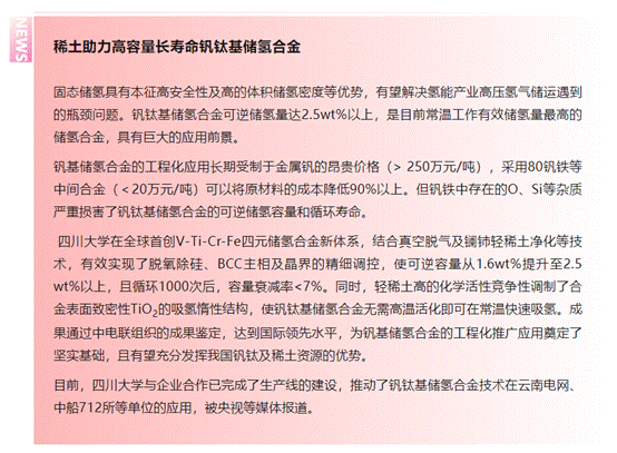 四川大学氢能团队首创V-Ti-Cr-Fe四元储氢合金新体系,成果通过鉴定,达到国际领先水平,具有巨大应用前景,入选2023中国稀土十大科技新闻。该体系采用80钒铁等中间合金,降低材料成本,同时利用真空脱气及轻稀土净化等技术,有效提高储氢合金性能,使可逆储氢量从1.6 wt%提升至2.5 wt%,循环1000次后,容量衰减率<7%。该项成果对我国氢能产业未来发展具有重要影响。