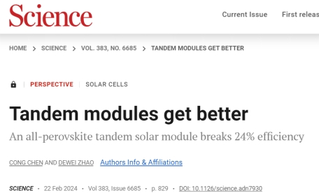 近日,我院赵德威团队针对全钙钛矿叠层太阳电池组件的最近进展,在Science上发表了题为“Tandem modules get better—An all-perovskite tandem solar module breaks 24% efficiency”的观点论文。四川大学为该论文唯一通讯单位,我院赵德威教授为通讯作者,陈聪特聘副研究员为第一作者。