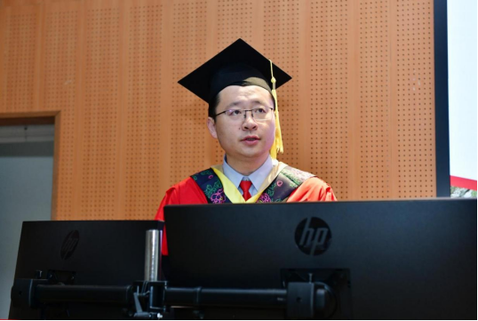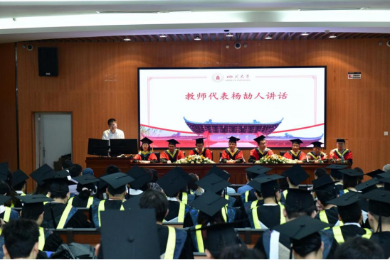 杨劼人研究员代表教师发言,他嘱咐毕业生们要成为有责任担当、脚踏实地、朝气蓬勃的青年人,无论今后身在何方,学院始终是坚强后盾,欢迎毕业生们常回家看看。