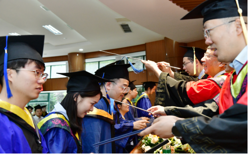 2024届毕业生依次走上主席台,接受学院领导颁发的毕业证书、学位证书,以及“拨穗礼”。