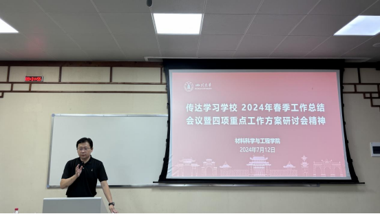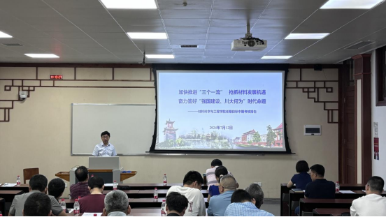 院长刘颖传达学校目标责任单位任期目标中期考核述职交流汇报会精神,做班子任期中期考核情况通报。在报告中,刘颖院长对2022-2024年学院工作进行了全面总结,系统的回顾了党建工作、学科建设、教学科研、人才引进等方面目标任务完成情况,详细阐述了材料学院特色亮点工作、不足之处和改进措施,提出了学院未来发展的思路与举措。同时,对人才引进、学科评估等工作做了重点分析,明确地提出了学院新的一年的目标和任务。