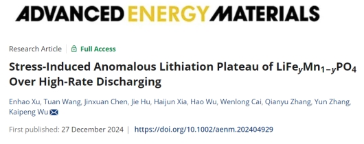近日,我校材料科学与工程学院武开鹏副研究员在《Advanced Energy Materials》上发表了题为“Stress-Induced Anomalous Lithiation Plateau of LiFeyMn1-yPO4 over High-Rate Discharging”的研究论文(https://doi.org/10.1002/aenm.202404929)。该论文第一作者为我校材料科学与工程学院2022级硕士研究生徐恩浩,通讯作者是武开鹏副研究员,四川大学为唯一署名单位和通讯单位。
