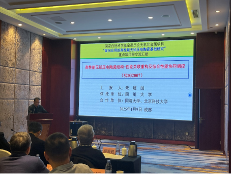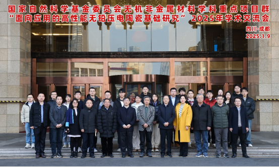 2025年1月9日,受国家自然科学基金委员会工程与材料科学学部无机非金属学科的委托,四川大学材料科学与工程学院在成都承办了国家自然基金重点项目群“面向应用的高性能无铅压电陶瓷基础研究”项目2025年度学术研讨会。中国科学技术大学李晓光教授;世界陶瓷科学院院士、浙江大学陈湘明教授;日本工程院外籍院士、清华大学李敬锋教授;“无铅压电单晶的多层次结构与外传响应关联机制”项目负责人、上海硅酸盐所罗豪甦研究员;“高性能无铅压电压电陶瓷结构性能关联重构及综合性能协同调控”项目负责人、四川大学朱建国教授,“高性能无铅压电陶瓷构效关系优化及器件关键技术”项目负责人、清华大学王轲研究员,以及重点项目群骨干成员40余人参加研讨会。四川大学科学发展研究院副院长、基金项目与成果管理部部长武梅教授、四川大学材料科学与工程学院党委书记邹勇研究员参加了会议。因在外出差,四川大学材料科学与工程学院院长刘颖教授1月9日晚上看望了与会代表。